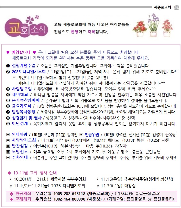 2025년 10월 12일 교회소식